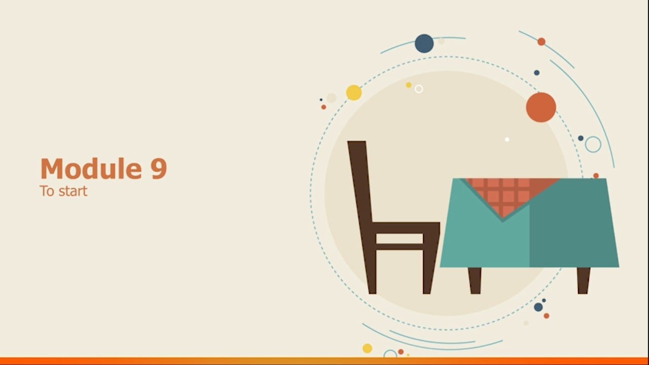 Cartoon dining table and chair and text that reads: Module 9 - To Start.