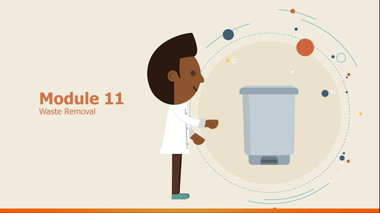 Cartoon chef with rubbish bin and text that reads: Module 11 - Waste Removal.