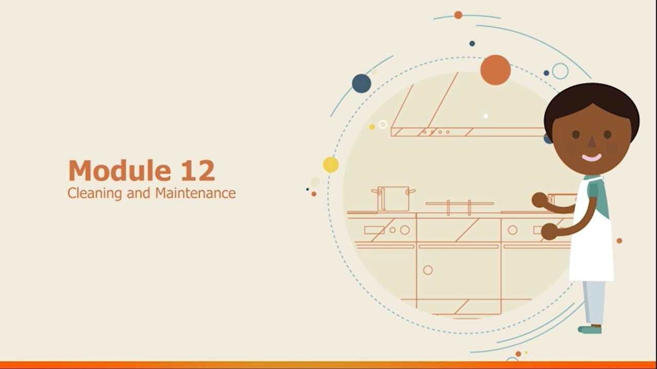 Cartoon chef with text that reads: Module 12 - Cleaning and Maintenance