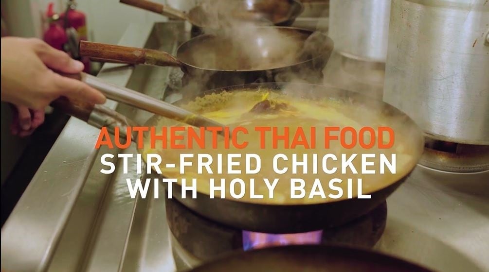 Kitchen scene with caption that reads: Authentic Thai Food  Stir-fried chicken with holy basil.