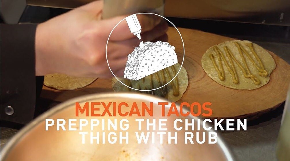 Prepping tacos with caption that reads: Mexican tacos - Prepping the chicken thigh with rub.
