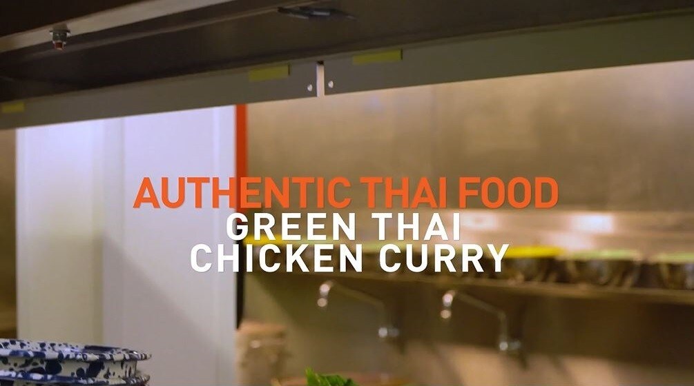 Kitchen scene with caption that reads: Authentic Thai Food - .Thai green chicken curry