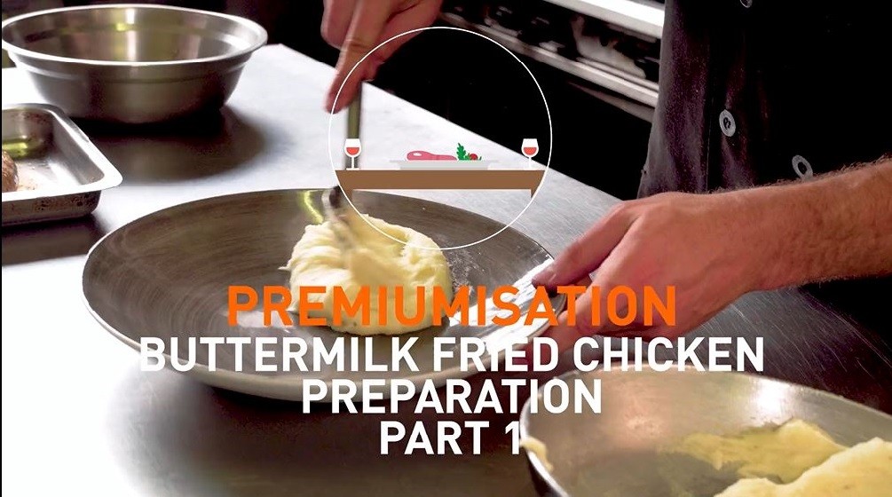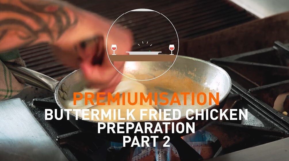 Kitchen scene with caption that reads: Buttermilk Fried Chicken Preparation Part 2