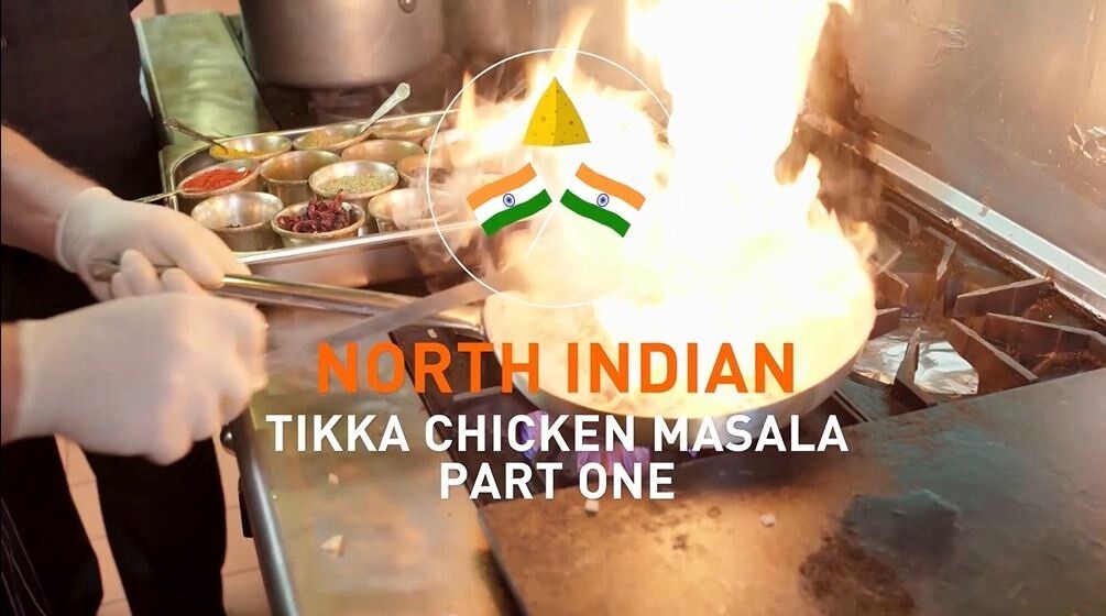 Kitchen scene with caption that reads: North Indian - Tikka Chicken Masala Part One