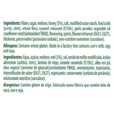 Water, sugar, maltose, honey (3%), salt, modified maize starch, food acids (acetic, citric), wheat flour, caramel colourant (E150c), garlic powder, vegetable oil (sunflower seed) (antioxidant TBHQ), flavouring, spices, flavour enhancer (E631, E627), thickener, preservative (potassium sorbate), non-nutritive sweetener (sucralose).
