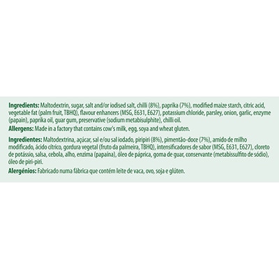 Maltodextrin, sugar, salt and/or iodised salt, chilli (8%), paprika (7%), modified maize starch, citric acid, vegetable fat (palm fruit, TBHO), flavour enhancers (MSG, E631, E627), potassium chloride, parsley, onion, garlic, enzyme (papain), paprika oil, guar gum, preservative (sodium metabisulphite), chilli oil.