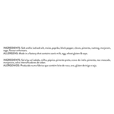 Salt and/or iodised salt, maize, paprika, black pepper, cloves, pimento, nutmeg, marjoram, sage, flavour enhancers.