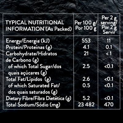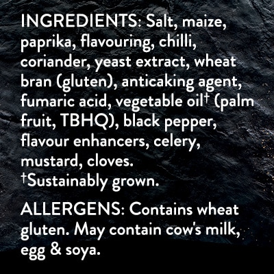 Salt, maize, paprika, flavouring, chilli, coriander, yeast extract, wheat bran (gluten), anticaking agent, fumaric acid, vegetable oil† (palm fruit, TBHQ), black pepper, flavour enhancers, celery, mustard, cloves. †Sustainably grown