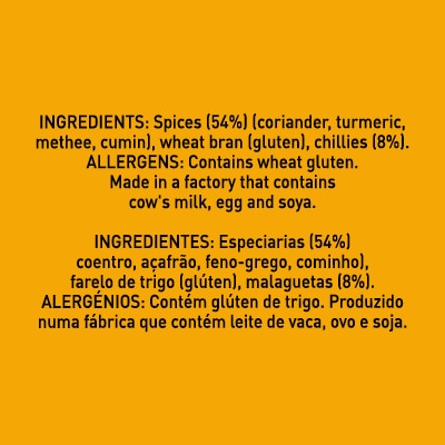 Spices (54%) (coriander, turmeric, cumin, methee), wheat bran (gluten), chillies (8%).