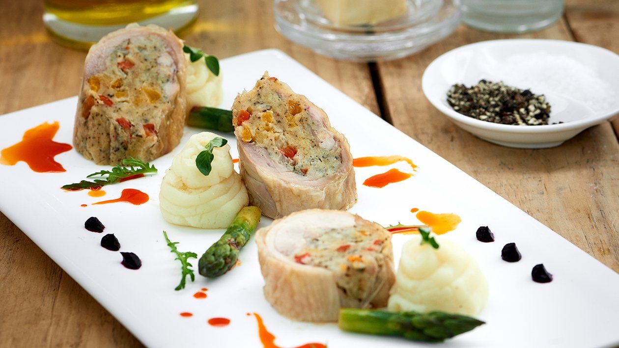 • Divide above mixture into two equal size portions. Drizzle a little oil on both sides of the chicken and place on a sheet of foil. Place mixture in the center of chicken and roll tightly. Tighten both sides and place on a baking tray to bake for 30 minutes at 170°C in a preheated oven.
