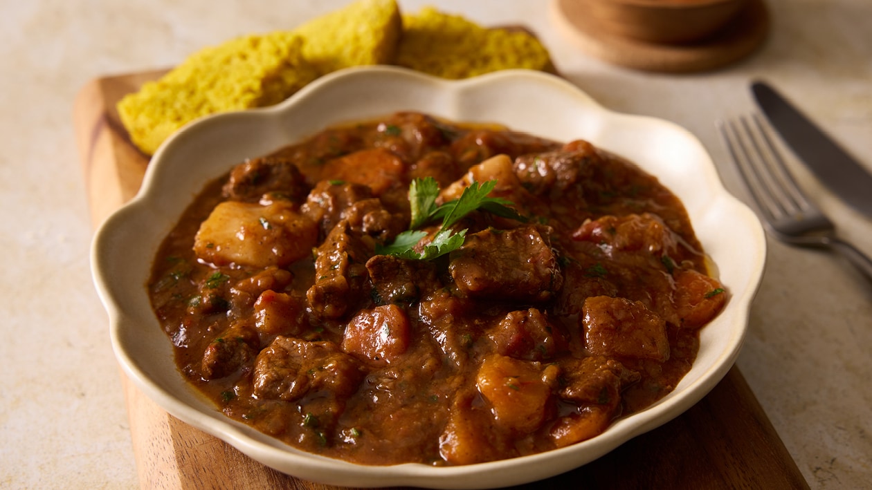 Diners will enjoy this ultimate comfort meal featuring tender bone-in beef cubes, slow-cooked in a rich, savoury gravy. This hearty stew is packed with potatoes, carrots, and butternut, thickened to perfection with Knorr Professional Brown Onion Soup. It is served with unique turmeric-infused steamed bread, perfect for soaking up every drop of flavourful gravy. Shot on location at UFS Head Office, Durban, South Africa.