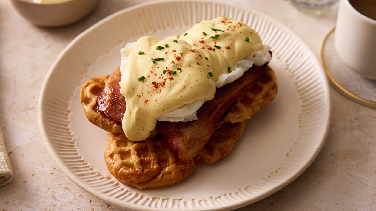 2. To Assemble: Place the waffle shape croissant onto the plate followed by crispy bacon, 2 poached eggs and Knorr Professional Hollandaise Sauce on top straight from the carton.