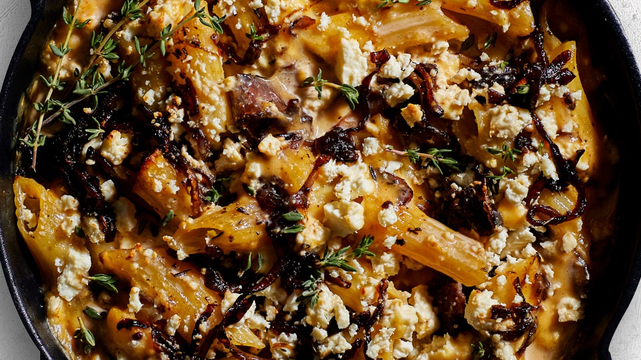 3. Mix the cooked macaroni, cheese sauce, biltong and half of the caramelised onion together in your prepared insert. Top with the remaining caramelised onion and crumbled feta to form a crust. Bake for 25 - 30 min.