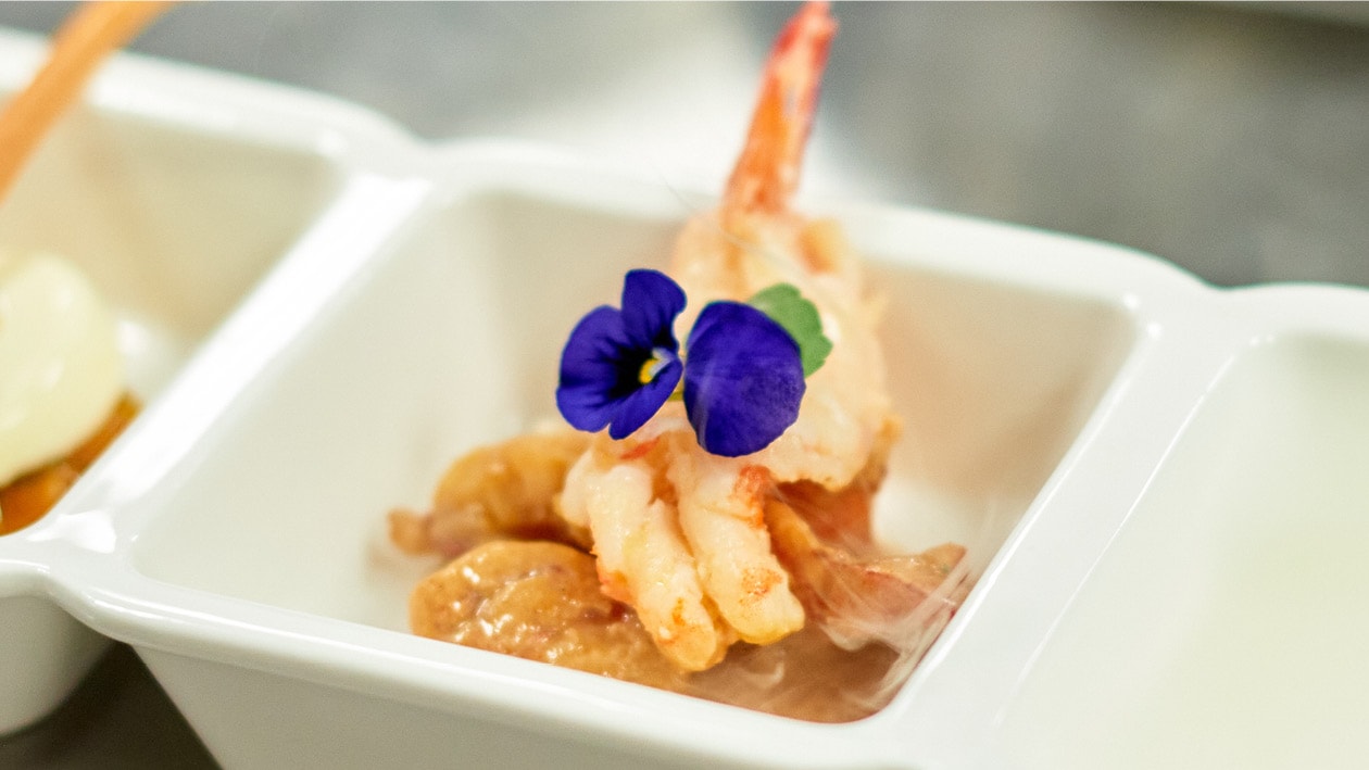 Succulent butter-poached prawns, complemented by the tropical sweetness of mango panna cotta with a burst of intense flavour from sun-dried tomato tian.