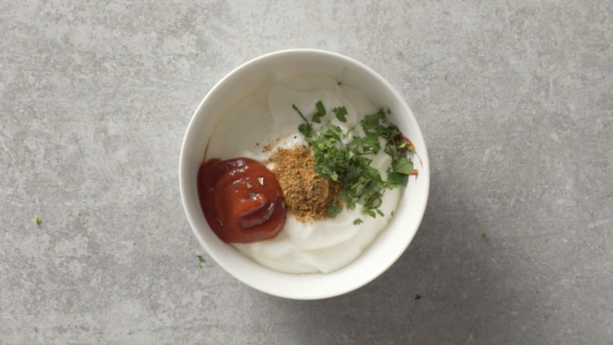• In a bowl, add 75g Hellmann's Original Mayonnaise, 1g Robertsons Cajun spice, 20g tomato Puree and 1ml coriander leaves and mix together till combined. use a required.