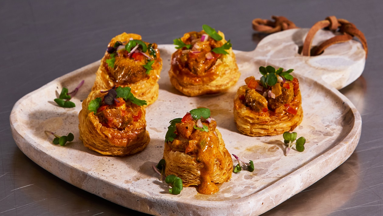 Cape Malay flavours bring warmth and aromatic spice to this refined take on a classic vol-au-vent. Fragrant spices and rich, savoury filling are encased in delicate pastry, reflecting the vibrant culinary heritage of the Cape. The result is a dish that honours traditional flavours while presenting them in an elegant, contemporary form.