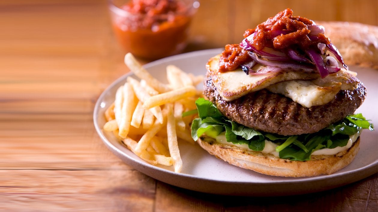 • Assemble the burger in the following order- toasted bottom burger bun, Hellmann's Original Mayonnaise, rocket, lamb patty, halloumi cheese, onions, napolitana sauce and top burger bun. Serve with freshly cooked shoestring fries.