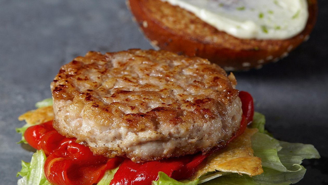 • Place the iceberg lettuce, crisp roasted chicken skin and roasted lettuce, crisp roasted chicken skin and roasted the chicken burger patty.