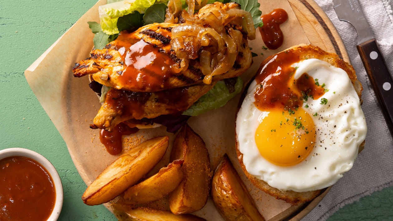 Fresh burger bun stacked with grilled chicken, caramelized onions, tangy Prego sauce, and crowned with a sunny-side-up egg.