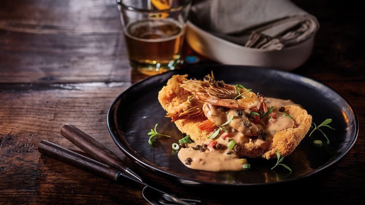 • Serve the schnitzel with the prawns, cream sauce and garnish with the crispy capers.