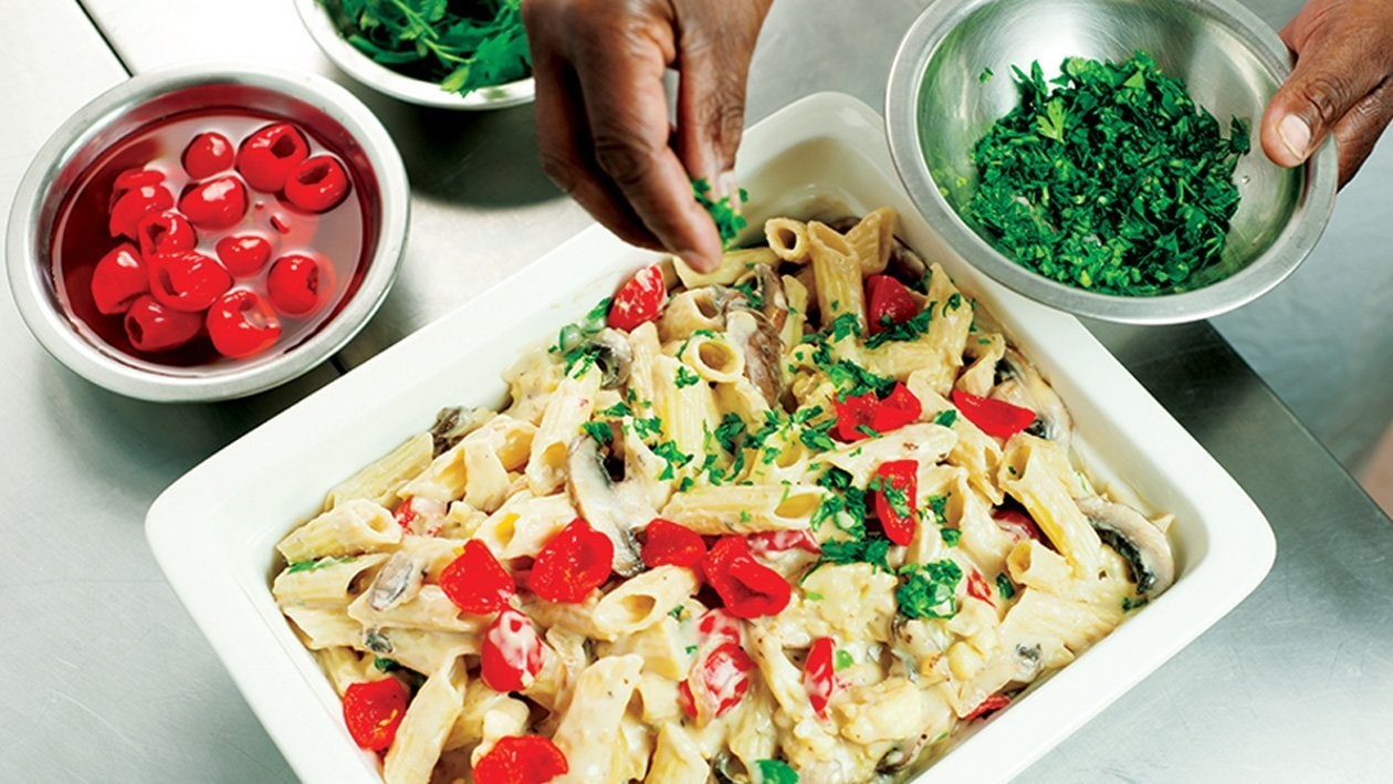 Penne pasta smothered in a  creamy cauliflower, mushroom and peppadew sauce.