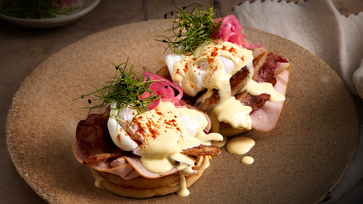 A hearty, elevated eggs benedict built on toasted English muffins and golden hash browns, with crispy bacon, prosciutto, and savoury sausage. Finished with poached eggs, velvety Knorr Professional Hollandaise Sauce, and a garnish of smoked paprika, pickled onions, and microgreens.