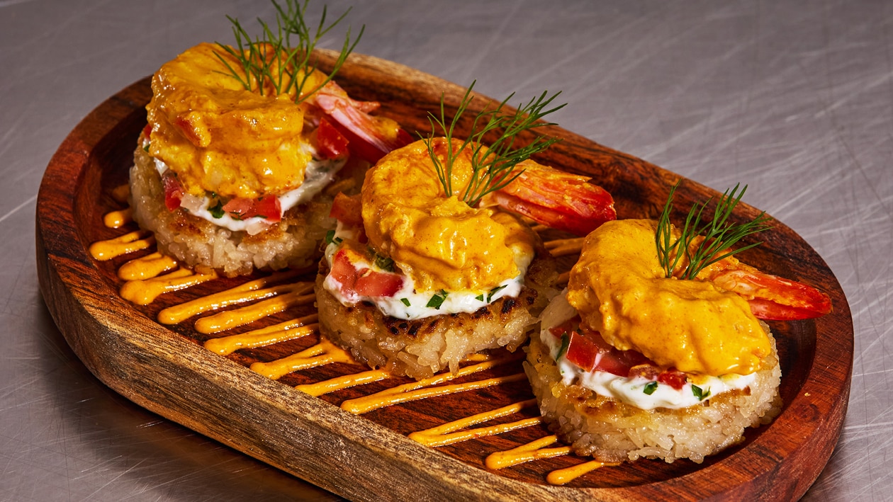 Crispy rice cakes provide the perfect base for this bold street food–inspired dish, combining texture and rich flavour in every bite. Topped with a luscious butter prawn curry, the dish balances golden crunch with creamy, aromatic spice. The result is a vibrant plate that elevates familiar street food elements into a refined, flavour-packed experience.