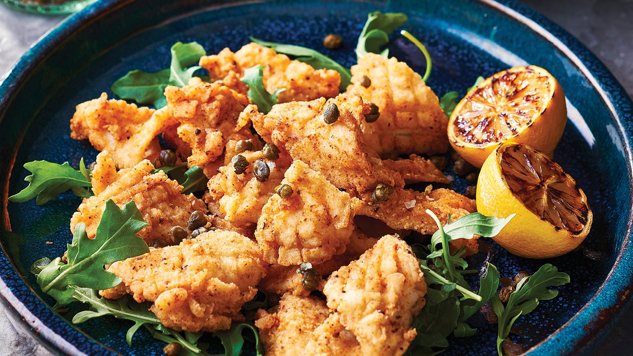 Serve the crispy squid on a bed of rocket leaves, sprinkle with the deep fried capers, chargrilled lemons and the sauce on the side.