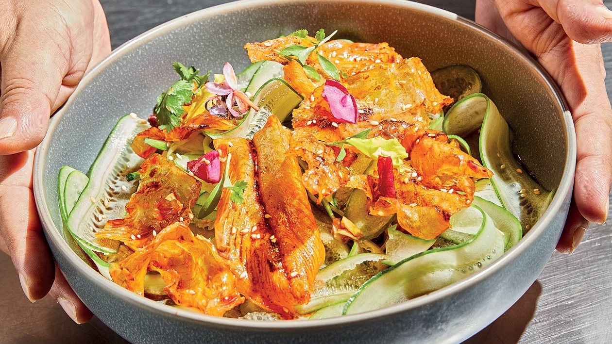 1. Mix water and Knorr Professional Chicken Stock Granules together, add hake, ginger and spring onion and brine or two hours. Rinse the surface, pat dry, quick freeze, then shave into 5mm thin slices. Place in a dehydrator and dry for 4 hours before removing.