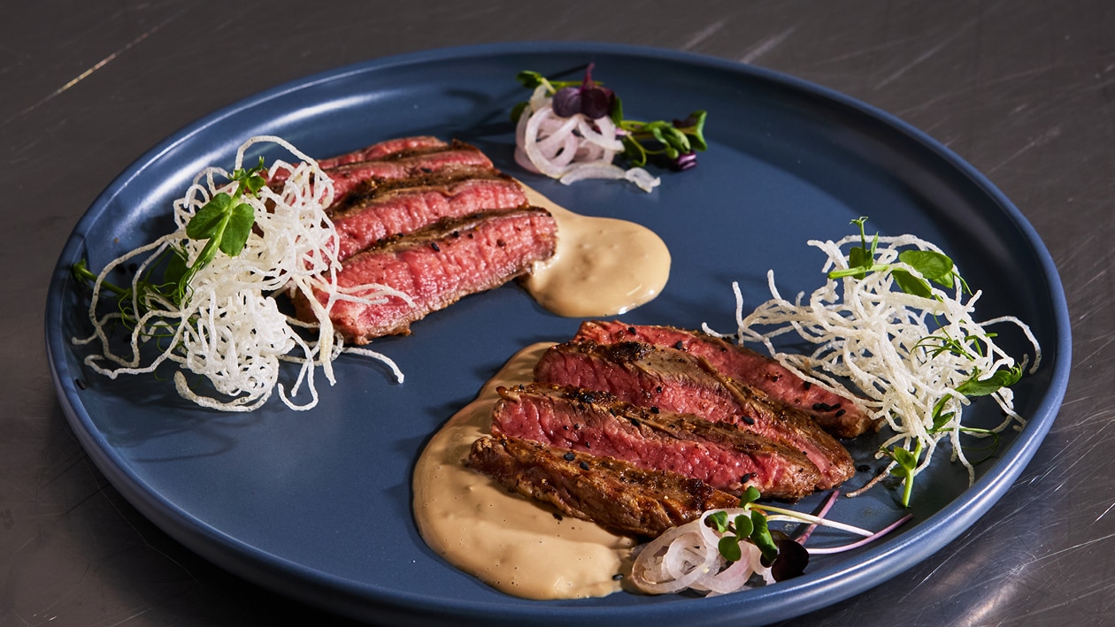 2. Arrange steak slices in a fan, drizzle umeboshi emulsion then add kataifi nest crunch, pickles shallots for acidity.