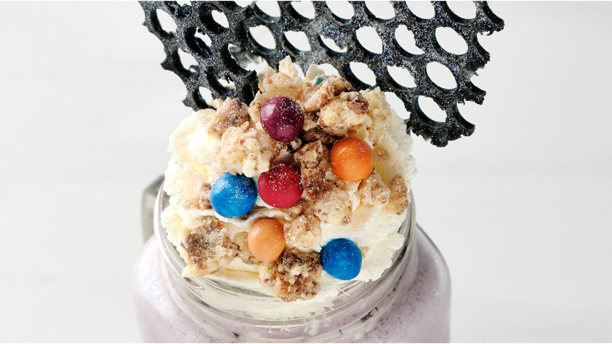 • Garnish with whipped cream, black chocolate honeycomb, hard candy balls and white chocolate moonrocks.