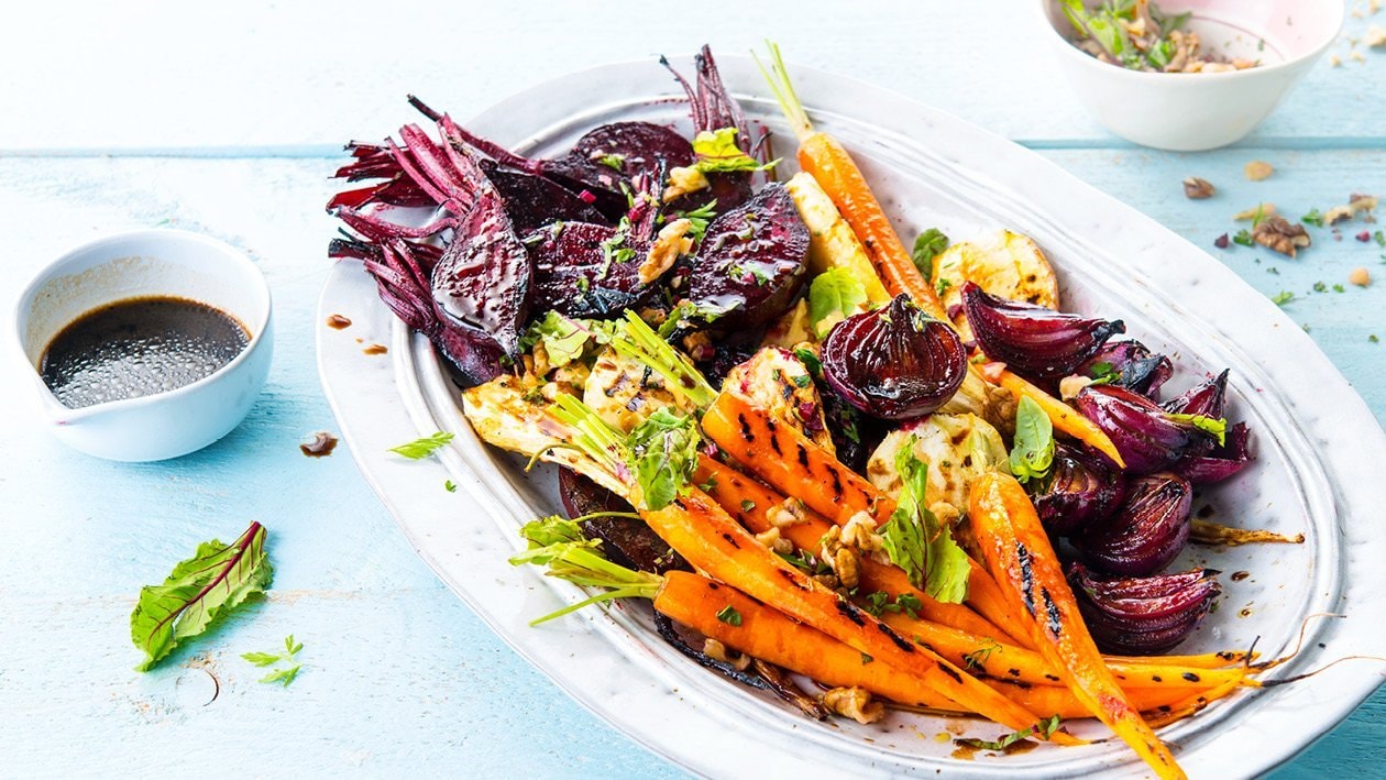 Mini beetroot, parsnip, carrots, and red onion, drizzled with a balsamic vinegar dressing and scattered with fresh walnuts,
