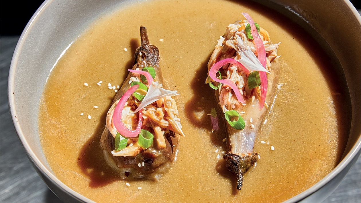 A modern take on a timeless technique. This bold starter pairs grilled aubergines with miso-infused chicken escabeche, blending Spanish preservation tradition with layers of Asian umami. Think vinegar, cinnamon, anise, and sesame — served ambient or cold for a dish packed with aromatic depth.