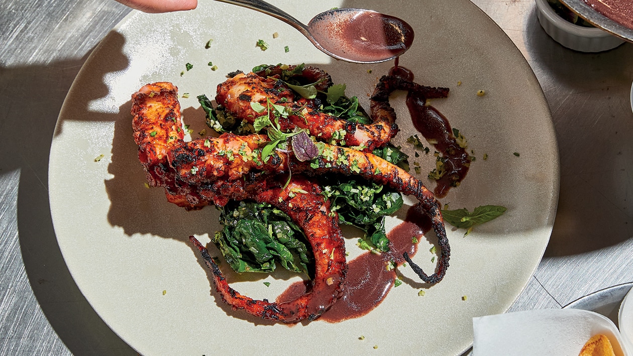 Smoky, sweet, and spiced. Octopus is marinated in guajillo, chipotle, and pineapple, then grilled to smoky perfection. It’s a Central American flavour bomb, softened with honey and lifted by a hint of cinnamon.