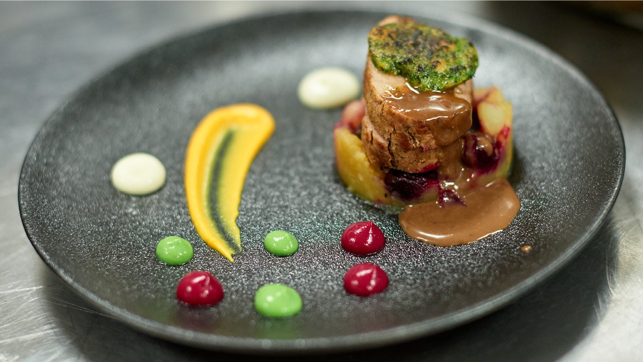 Rich and tender, herb-crusted kudu loin paired with creamy sweet potato and earthy beetroot, elevated with a unique chilli chocolate sauce and a sweet, tangy berry compote.