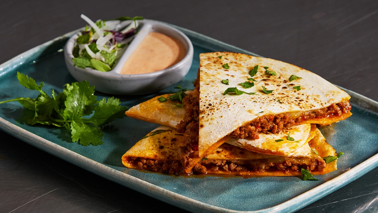 Inspired by lahmacun, this Middle Eastern style flatbread takes the form of a quesadilla, topped, folded, and grilled to perfection. Traditional lahmacun flavours shine through in the savoury beef mince, rich tomatoes, warm paprika, fragrant mint, creamy yogurt, and the deep spice of harissa and garlic. The addition of cheese brings a sweet, caramelised richness, while grilling creates a warm, comforting dish that blends Middle Eastern spice with the indulgent melt of a quesadilla.