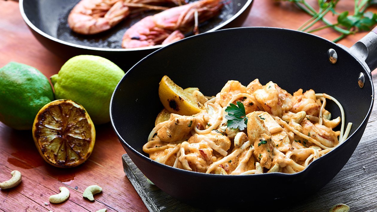 Delightful chicken and prawns creamy pasta,  topped with lemon zest, toasted cashew nuts and fresh coriander
