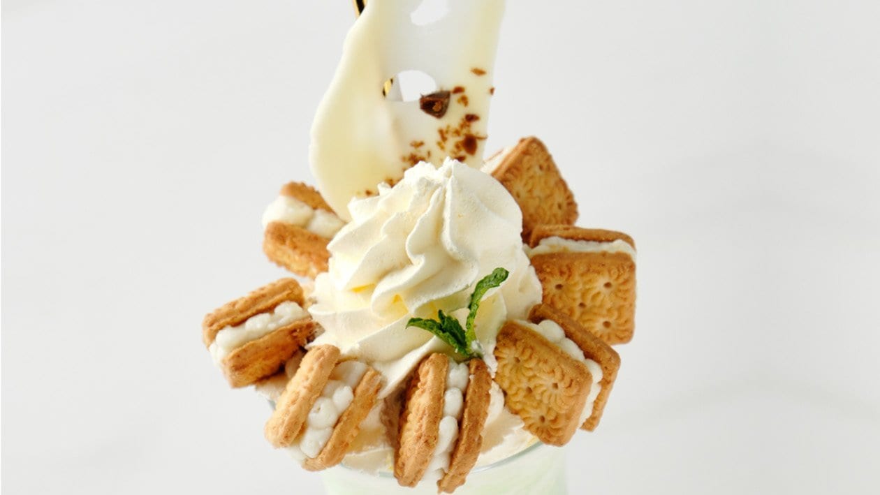 • Garnish with whipped cream, mini tennis biscuit cheesecake sandwiches, a mint leaf and a white chocolate shard.