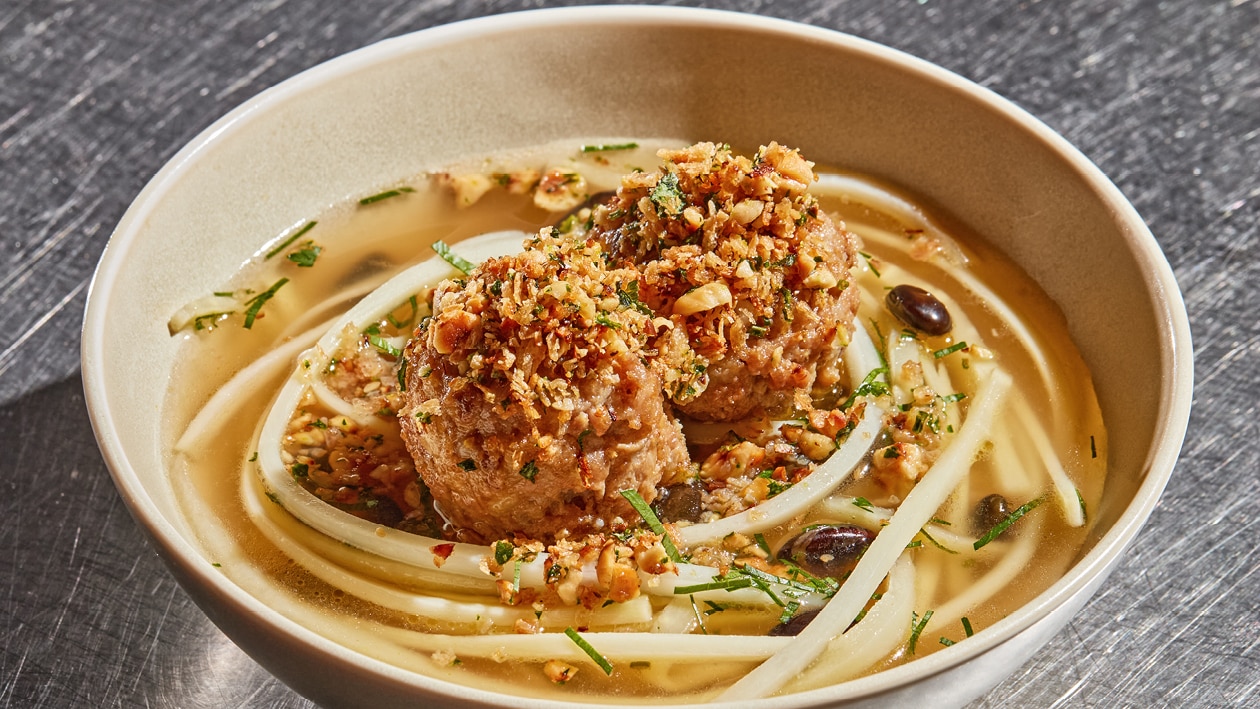 7. Add the udon noodles and meatballs to the soup, and top it off with the peanut and herb crunch. Serve instantly and smoking hot!
