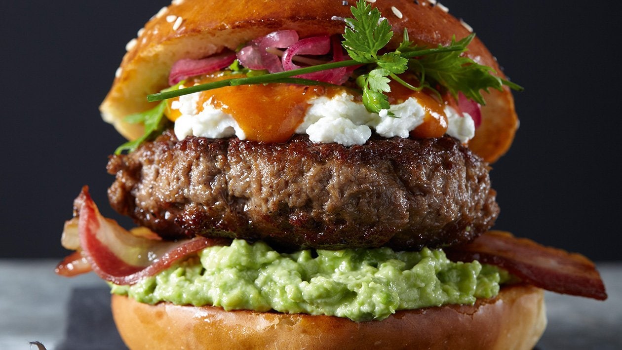 • Place the avocado on the base of the burger with the grilled streaky bacon and beef patty.