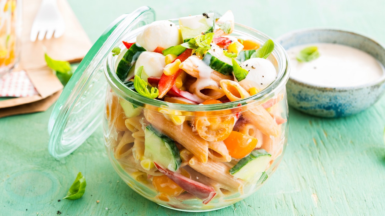 3. Mix the noodles, corn and cucumber in a bowl with the Hellmann’s Tangy Mayonnaise and Knorr Professional Sweet & Sour Sauce and season with pepper. Put into glass jars, place tomatoes and mozzarella on top and seal with the lid.