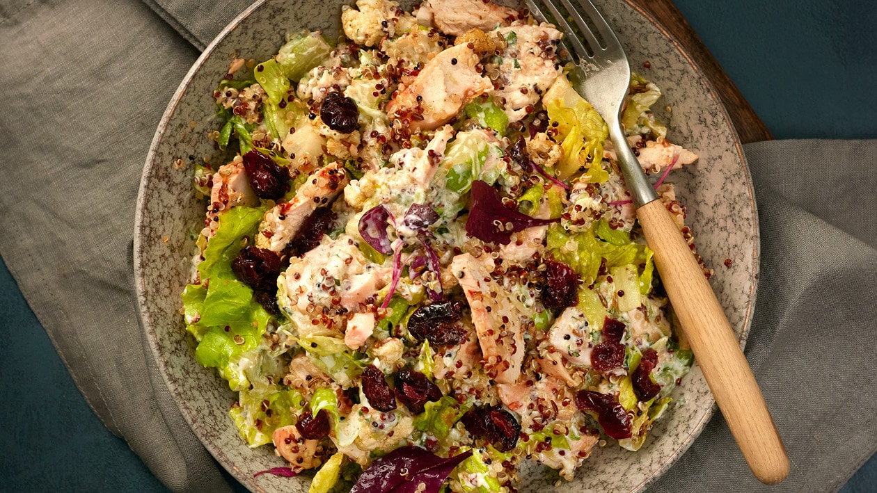 3. Add the cooked quinoa, cranberries, cooked peri-peri chicken, cos lettuce leaves and cooked cauliflower.