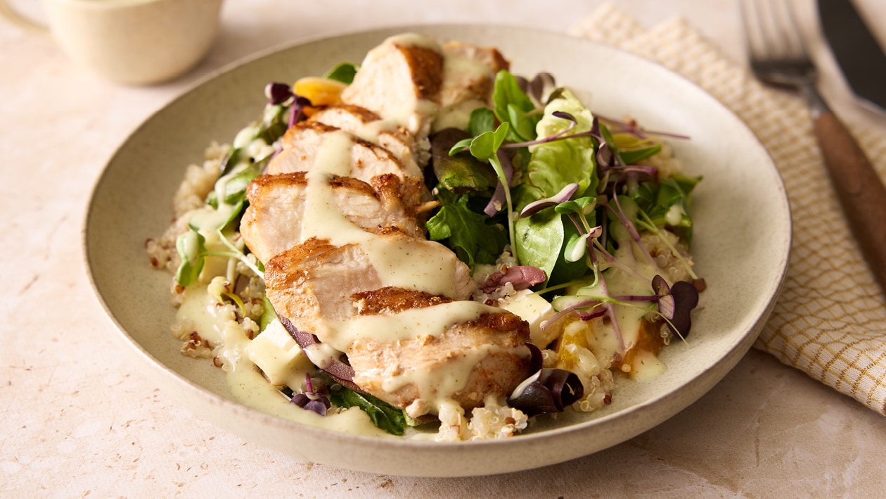 3. Layer salad by placing mixed leafy greens as the base, exotic tomatoes, red onions, cucumber, Kalamata olives, feta cheese and quinoa around the salad. Cut and fan out chicken breast, place on top of the salad. Pour over Hellmann’s Greek Salad Dressing. Garnish with micro herbs.