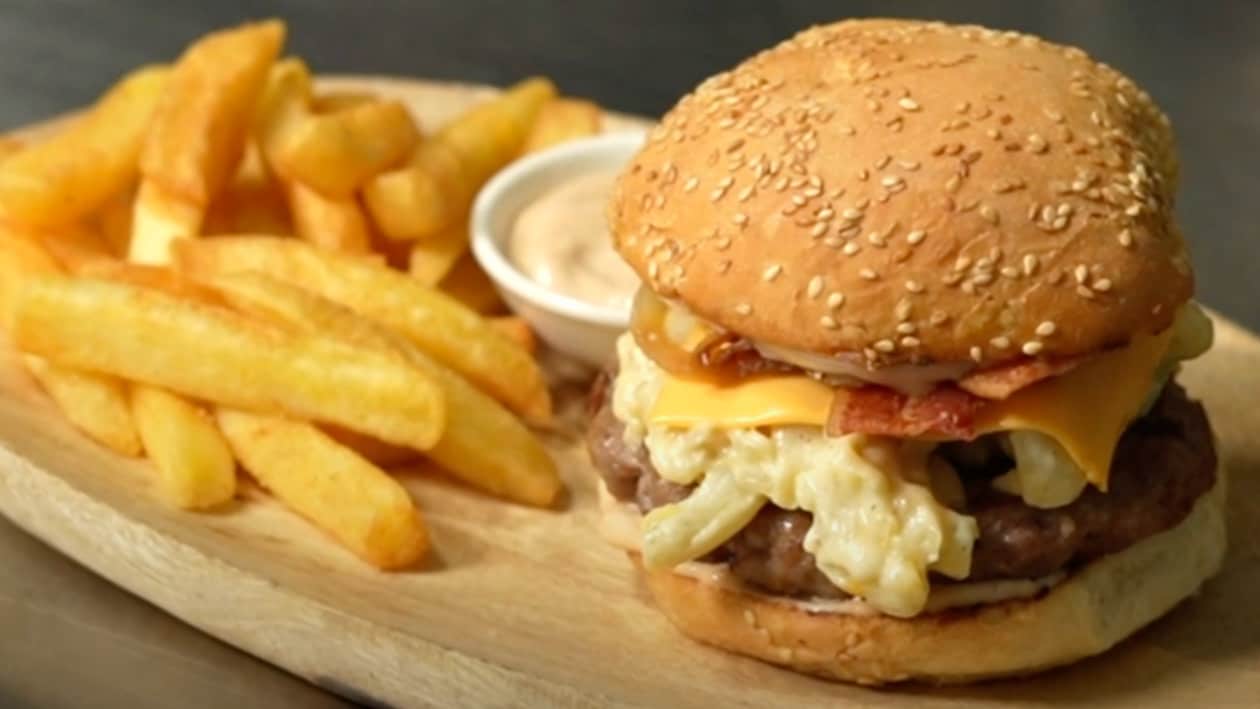 2. Spread 15 ml of the prepared BBQ mayonnaise on each side of the bun, then add the grilled beef patty, ¼ cup mac & cheese, 1 slice of cheese, 2 slices of grilled bacon, and caramelised onion.