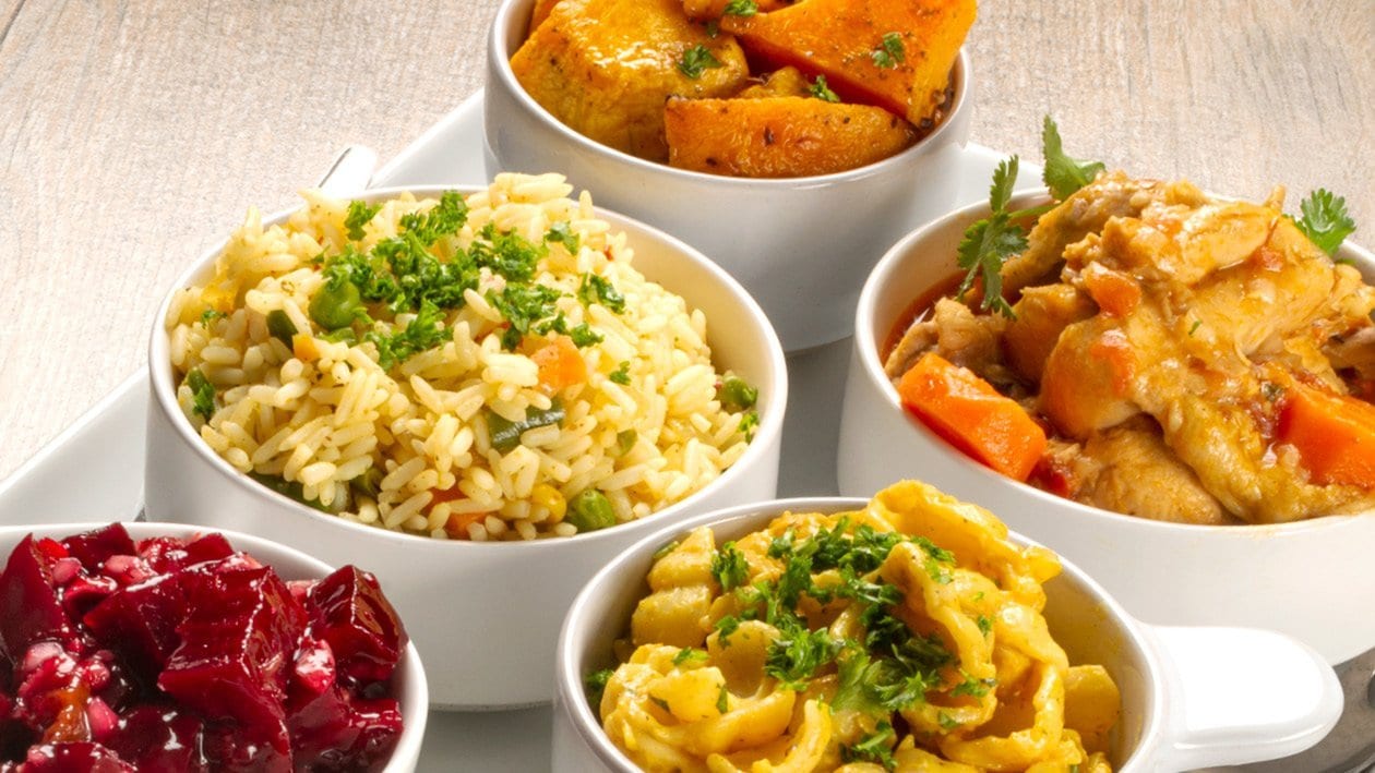 This hearty feast features a colourful assortment of vegetables, salads, chakalaka, chicken stew and savoury rice  – all your favourites in one meal!