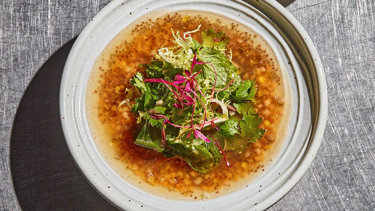This nourishing soup brings together red and green lentils with chia seeds for a hearty, protein-rich base. Onion, carrot and garlic add depth and warmth, while pumpkin seeds and mushroom croutons introduce a satisfying crunch. Finished with fresh herbs and a light apple cider and sesame dressing, the dish balances comfort with freshness in every bowl.