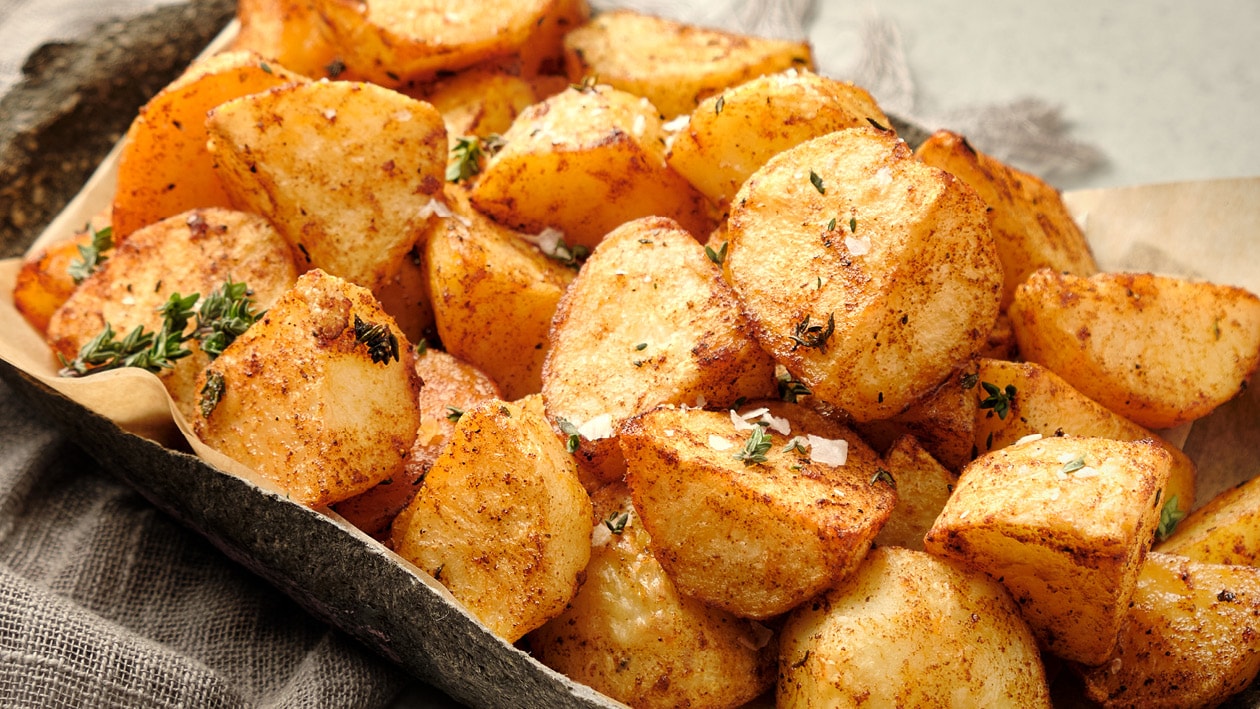 The perfect quick and easy side dish! Crispy, smoky, oven-roasted potatoes seasoned with Robertsons Smoked Paprika and fresh garlic, and topped with fresh thyme to finish.