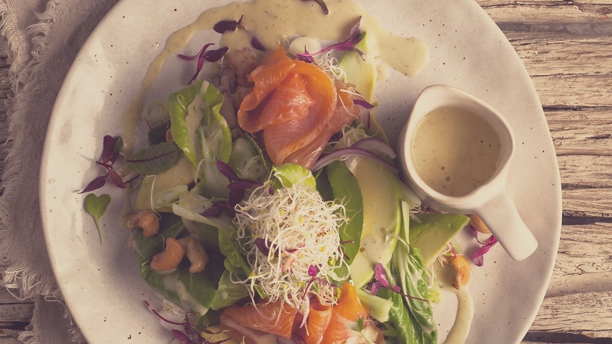 1. Layer bok choy with salad ingredients. Add smoked trout and alfafa sprouts.