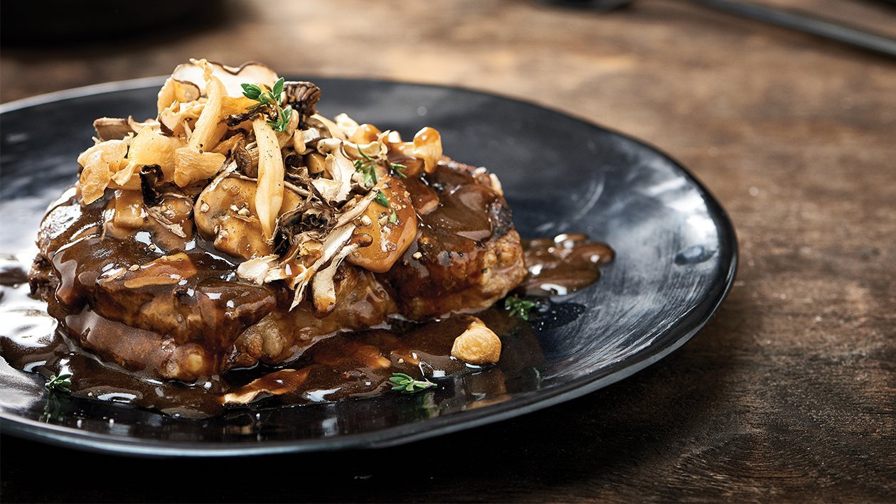 • Pour the sauce over the steak, and top with the mussels and bacon crumb.