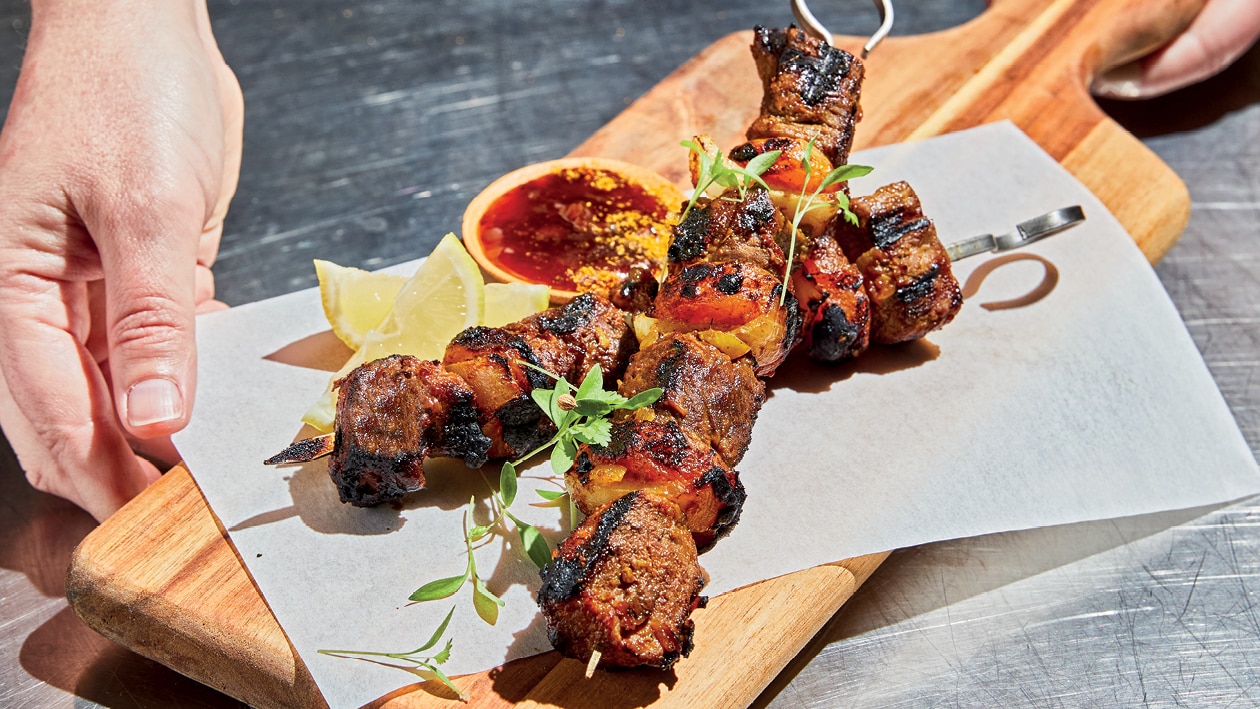 Cape Malay soul, braai-style. Lamb leg is marinated in apricot jam, chutney, curry, and spice, then skewered with onions and soaked apricots. Cooked over an open flame, it’s smoky, sweet, and steeped in South African tradition – a skewer that tells a story.